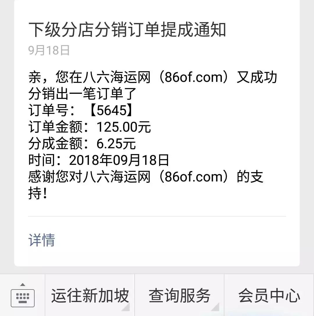 您的朋友每次发货,您都会得到3%的运费奖励,且收到微信通知: